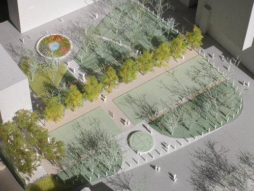 A large central lawn. e horizontality of the space presents a contrast to the verticality of the large volume of the new academic building tower nearby. e line of deciduous tall trees along the lawn traces the shape of the old building that formerly existed on the site and serves as a foothold for carrying the past into the future.